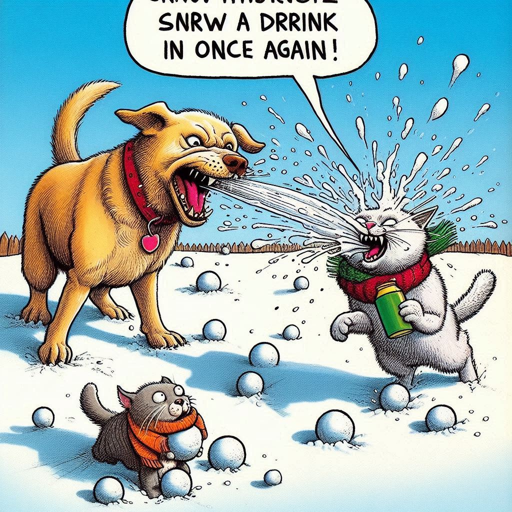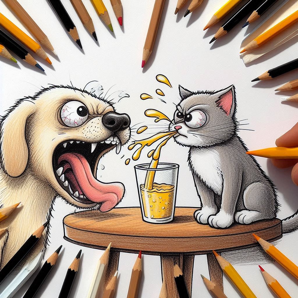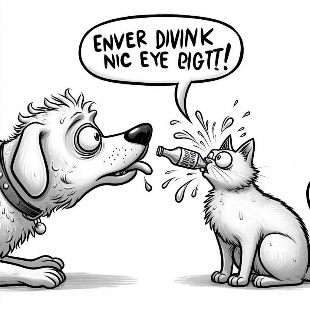 개와 고양이가 서로 눈(eye)싸움을 하다가...어느 한 쪽이 입에 머금고 있던 음료수를 뿜는 그림을
