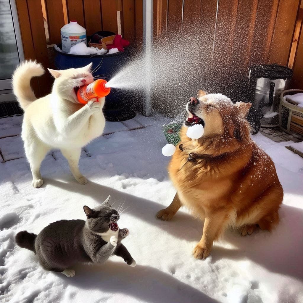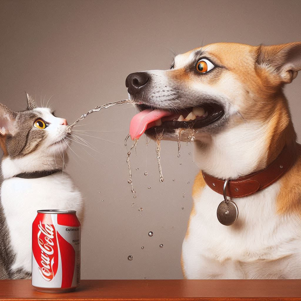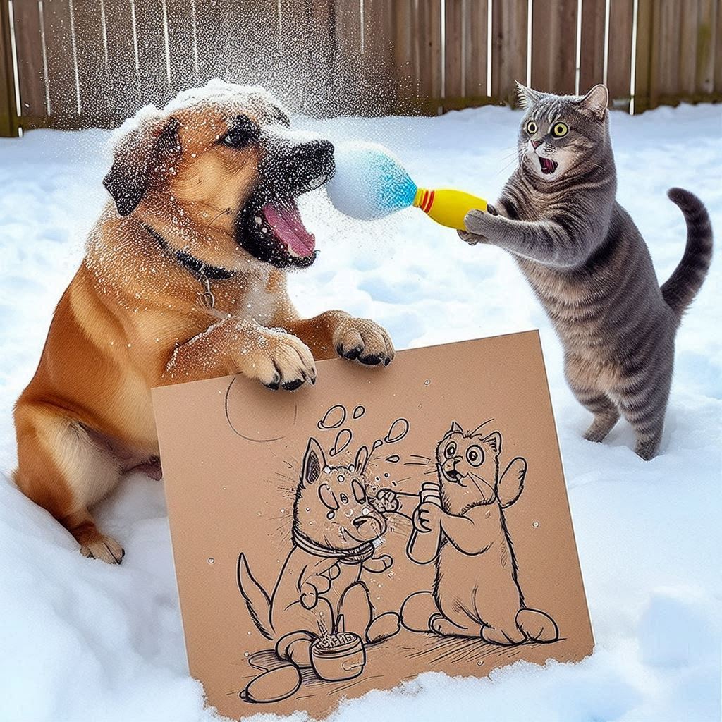 개와 고양이가 서로 눈(eye)싸움을 하다가...어느 한 쪽이 입에 머금고 있던 음료수를 뿜는 그림을